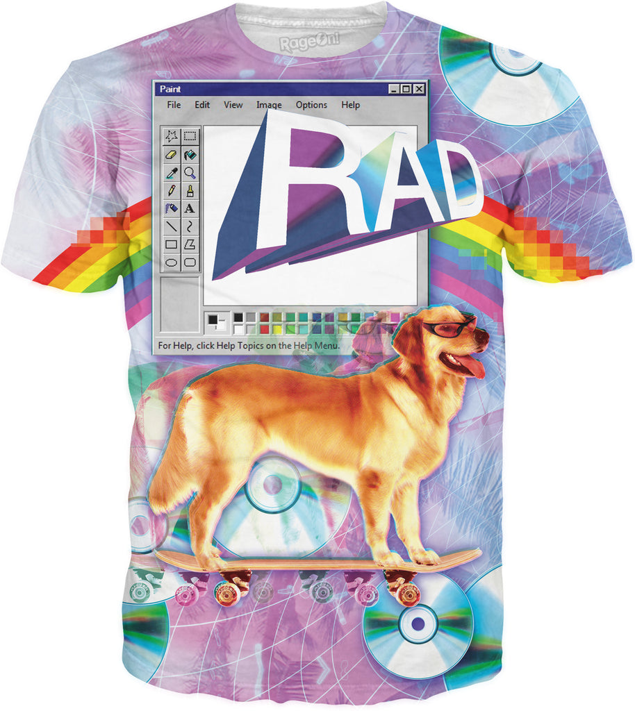 Be your best in this mind-blowing, all-over-print Rad T-shirt! Features such wonders as rainbows, a skateboarding dog, and more awesomeness than you can possibly handle.