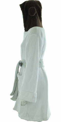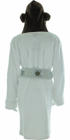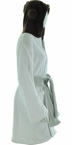 Feel like a galactic princess when you wear this junior-size Star Wars robe! The Star Wars Leia Fleece Junior Robe is a white, hooded bathrobe, available in junior sizes for women. This warm and comfortable fleece robe mimics the white dress worn by Princess Leia in the Star Wars movie series, and the brown hood features faux "hair buns" on each side. "You have your moments. Not many of them, but you do have them."
