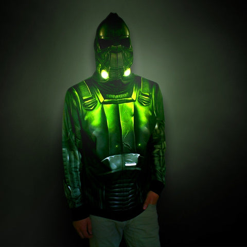 This menacing Star Wars hoodie is embroidered and printed with the armor of a Death Trooper! The Star Wars Rogue One Death Trooper Face Zip Hoodie is green with a zipper closure from waist to top of head and mesh eyes. Inspired by the movie Rogue One: A Star Wars Story, this warm and comfortable hooded sweatshirt doubles as a costume depicting a Death Trooper, elite members of the Galactic Empire's Stormtrooper force dedicated to Military Intelligence!